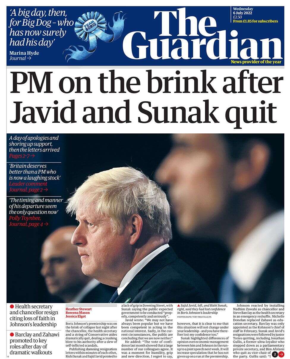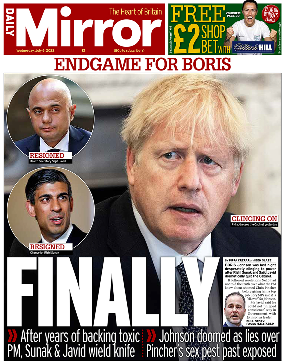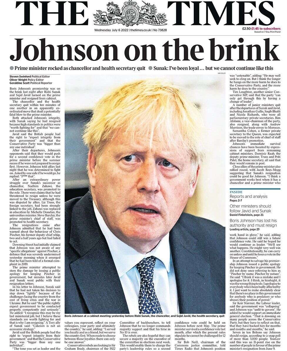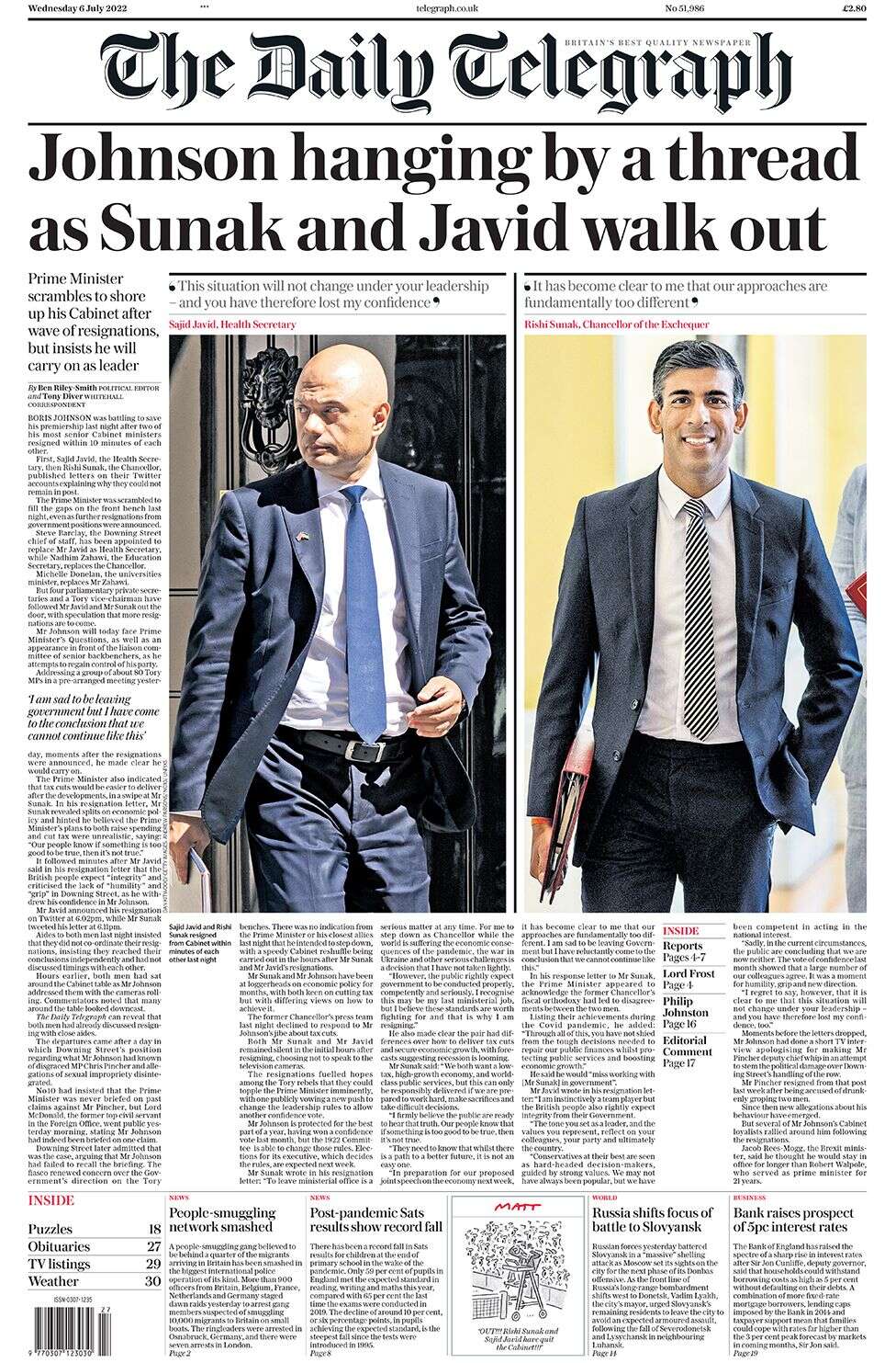 It says: “The joint resignations of the Chancellor Rishi Sunak and Health Secretary Sajid Javid have punched a hole in the heart of the Cabinet that will be impossible to repair, assuming the Prime Minister even tries…