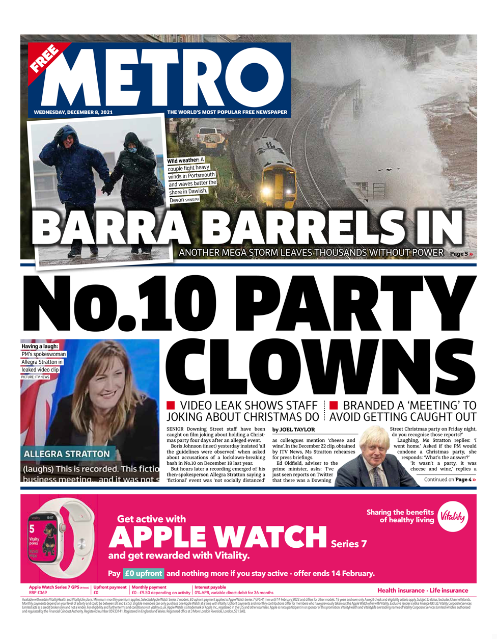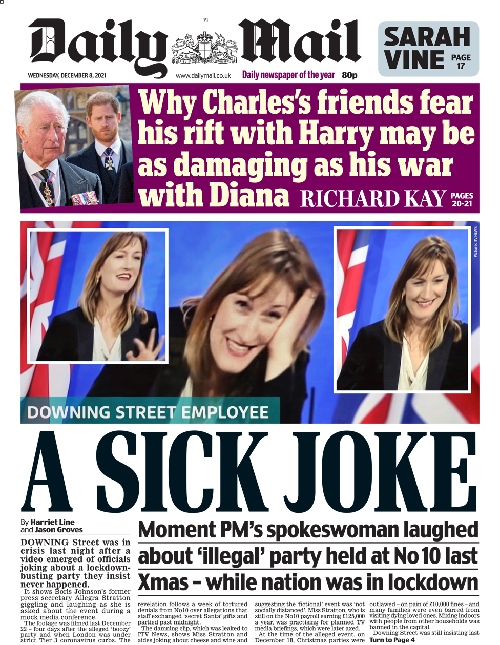 The Daily Mail headline described it as a “sick joke” with three photos of Stratton laughing while the Metro called them the “No 10 party clowns”.