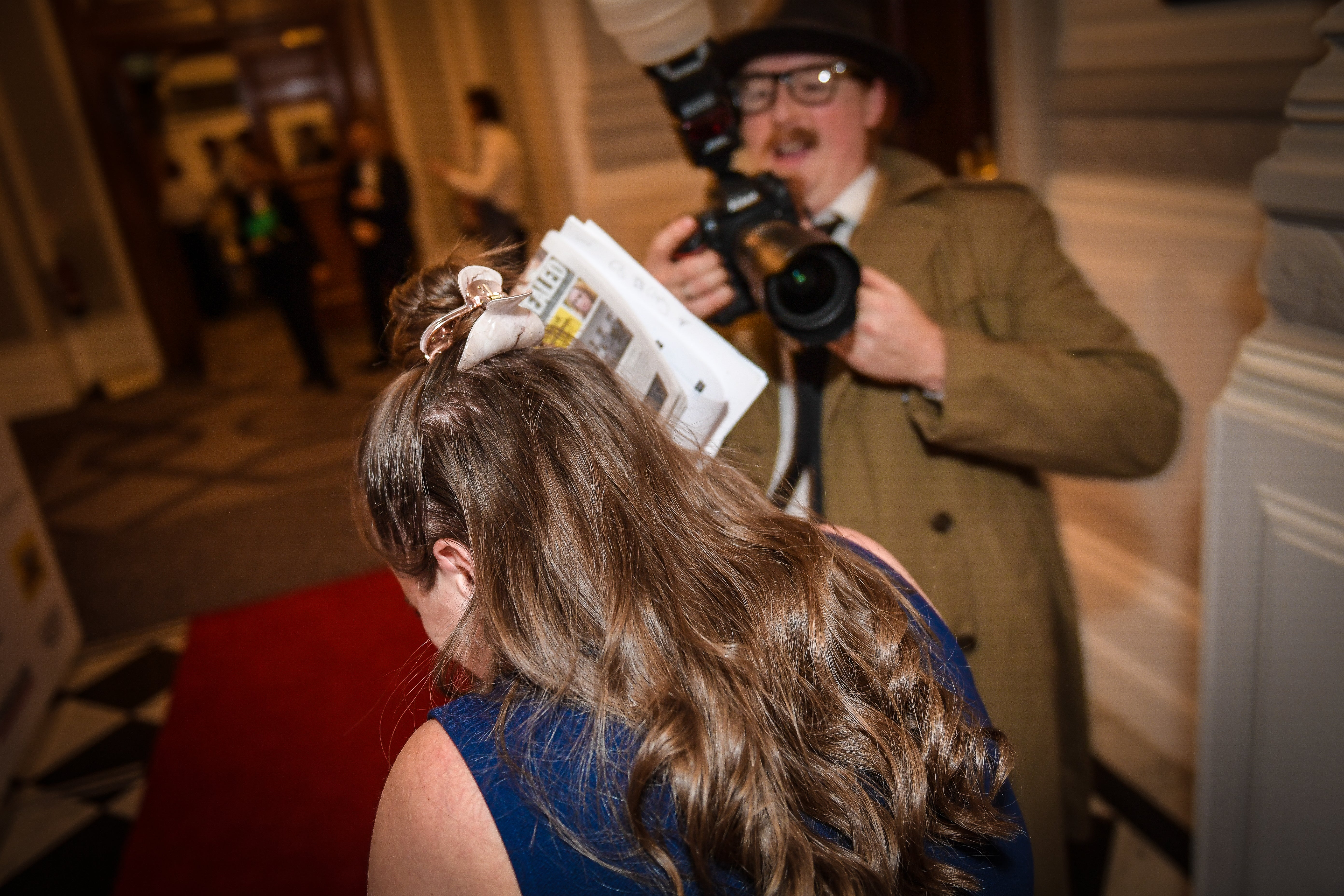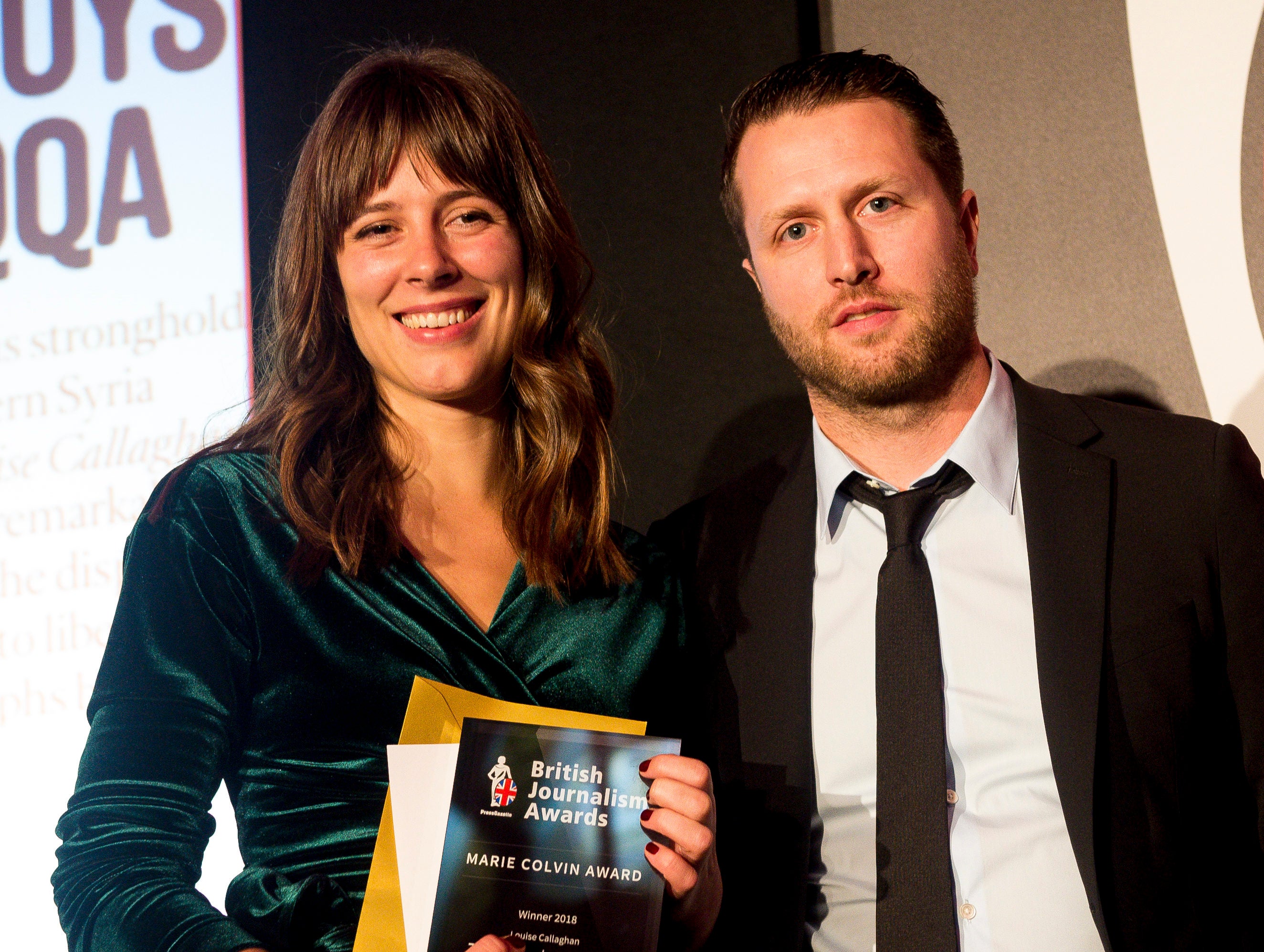 Louise Callaghan for The Sunday Times picks up the Marie Colvin Award from A Private War director Matthew Heineman. Picture: Press Gazette