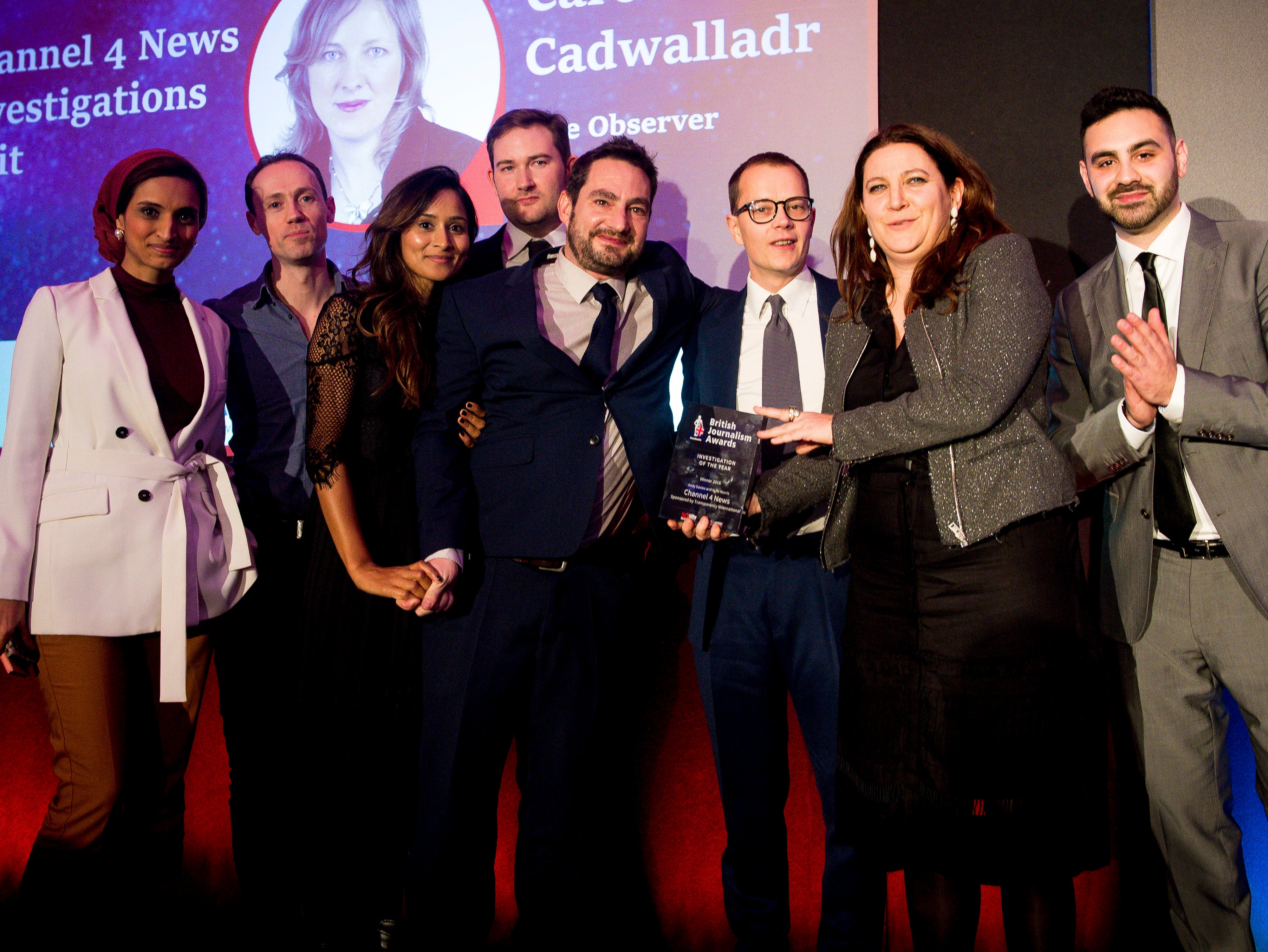 Carole Cadwalladr and the Observer team after she won Investigation of the Year at the British Journalism Awards 2018, with Dominic Kavakeb, head of communications at sponsor Transparency International UK. Picture: Press Gazette