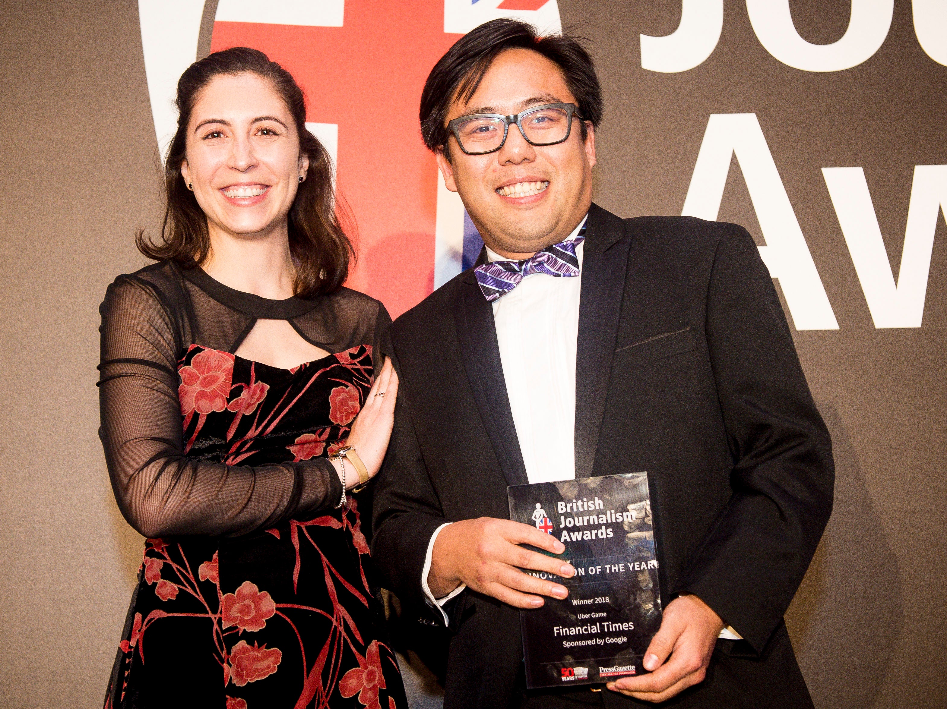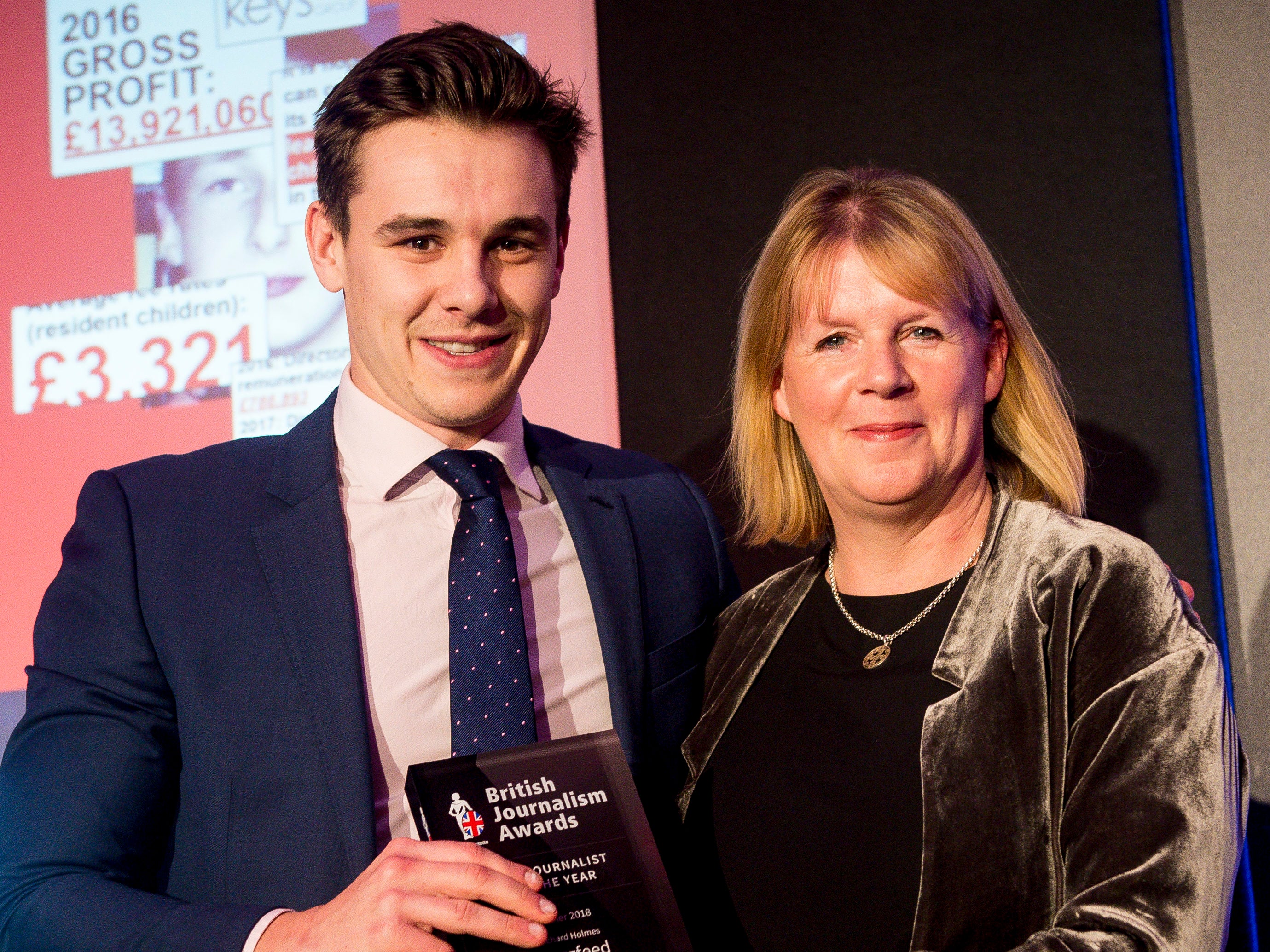 New Journalist of the Year Richard Holmes of Buzzfeed with Karen Fowler Watt from sponsor Bournemouth University. Picture: Press Gazette