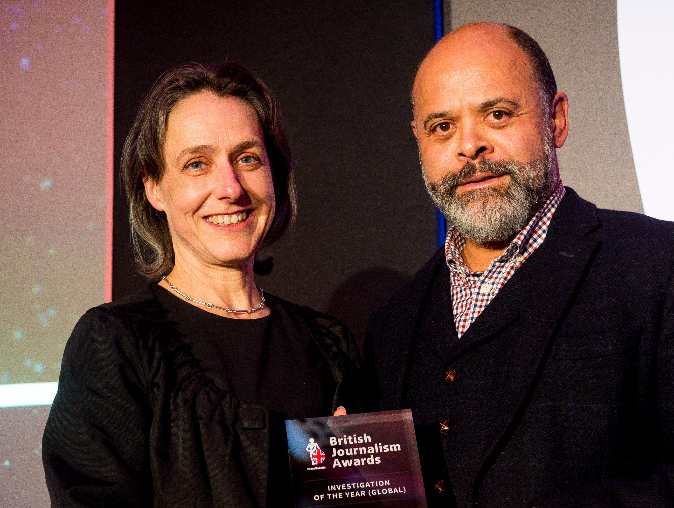Janet McBride, International Editor, Enterprise and Investigations at Reuters collects the Foreign Affairs Journalism prize at the British Journalism Awards 2018 on behalf of Wa Lone and Kyaw Soe Oo. Picture: Press Gazette